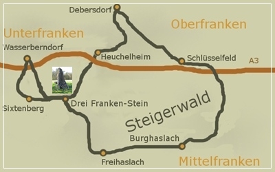 ![]() Debersdorf-Heuchelheim-Drei Franken Stein-Wasserberndorf Sixtenberg-Freihaslach-Burghaslach-Schlüsselfeld ca. 30 km |