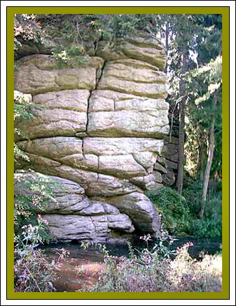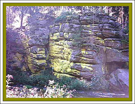 Zwischen Leupoldshammer und Blumenthal findet der aufmerksame Wanderer am rechten Egerufer den sogenannten Teufelstisch oder auch Teufelsplatte genannt. Der Kreis hat einen Durchmesser von 1,6 Meter und liegt auf einer 15 Meter großen Granitplatte. Die herausgehauenen Rillen bezeichnete der Volksmund als "Blutrillen".Tatsächlich wurde aber hier um1746 Baumharz gewonnen, daß zur Herstellung von Wagenschmiere (Pech) diente. Dieser Schmierofen funktionierte im Prinzip wie ein Kohlenmeiler. |